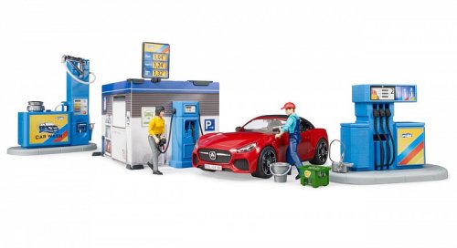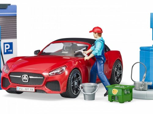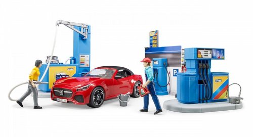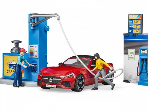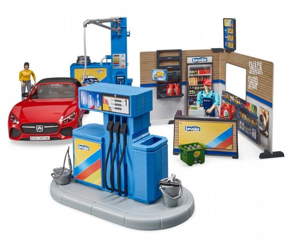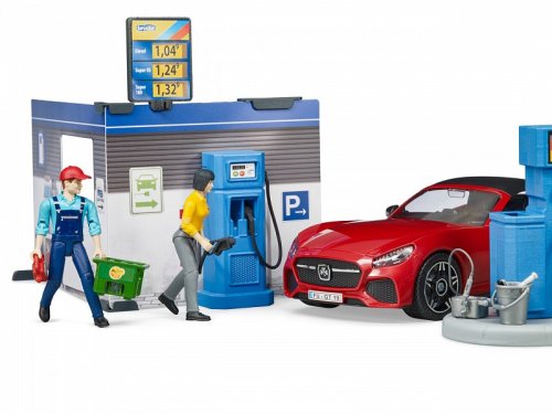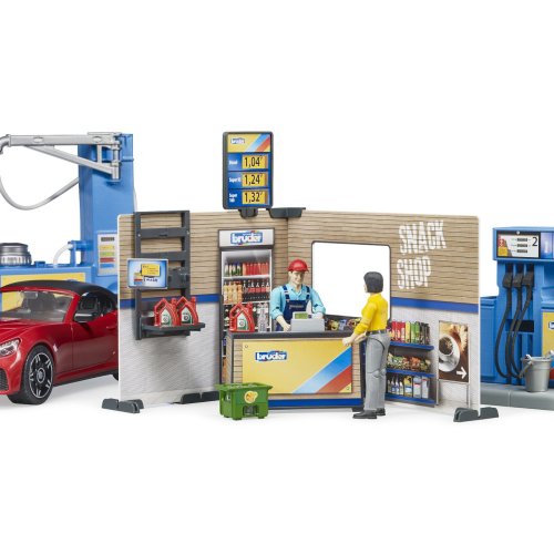 Každé auto Bruder predsa potrebuje mať kde natankovať alebo sa nabiť. A nielen to, vodič sa predsa tiež potrebuje občerstviť a privíta možnosť svoje auto aj umyť. Vhod pritom určite príde ústretová profesionálna obsluha. S modelom čerpacej stanice sa všetky tieto možnosti ponúkajú. Umývacia linka je pritom plne funkčná, stačí doplniť vodu do zásobníka a stlačiť tlačidlo! Kulisy stanice sú detailne obojstranne potlačené a opatrené funkčnými podrobnosťami, policou s kanistrami a cenníkom. Súčasťou sady je aj ďalšie drobné príslušenstvo, prepravka, parný čistič a vedro so stierkou na umývanie okien. Variabilné športové auto má odnímateľné kolesá aj strechu a je samozrejme kompatibilné s figúrkami Bruder BWORLD. Vyrobené v Nemecku, z kvalitných materiálov. Hlavné vlastnosti:pumpa, umývačka, stanica, auto a 2 figúrky2 obojstranne potlačené steny stanice s pútačom, policovým dielom a pokladničným pultom3 kanistre, vedro so stierkou, parný čistič a prepravka s fľašamiumývačka je funkčná, možno ju plniť vodouodnímateľné kolesá a strecha autakompati príslušenstvomvyrobené v Nemecku