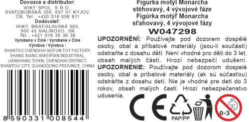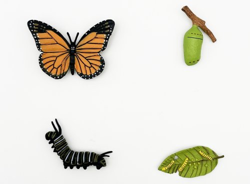 Figúrka Motýľ 4 vývojovej fázy. Veľkosť 8 cm. 4 varianty - vajíčka, húsenica, kokon, motýľ. Vajíčka: 6,5x3,2x0,5 cm Húsenica: 6,5x2x5,5 cm Kokon: 5,7x3,7x1,9 cm Motýľ: 8,3x6x1 cm