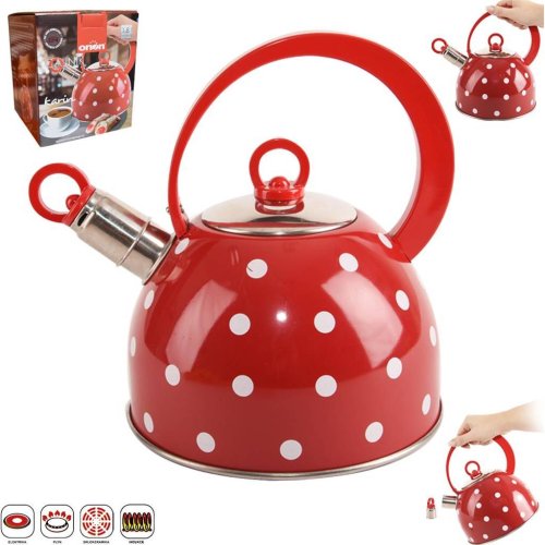 Červená kanvica s bielymi bodkami na varenie čaju vhodná na všetky typy sporákov.