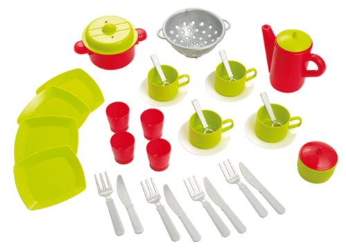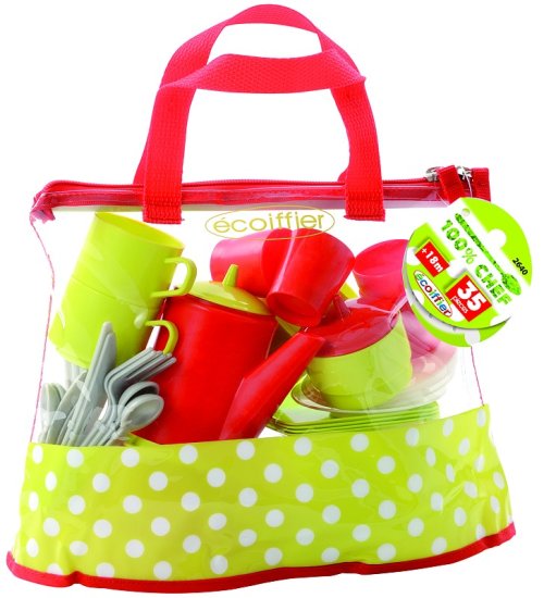 Veľká priehľadná taška so zipsovým zatváraním obsahuje štyri taniere, sadu štyroch príborov, štyri poháriky, štyri plastové hrnčeky s podšálkami, kanvičku, cukorničku, sito a hrniec s pokrievkou. Všetko plastové. Vhodné pre deti od 18 mesiacov. Veľkosť tašky 29x12x30 cm.