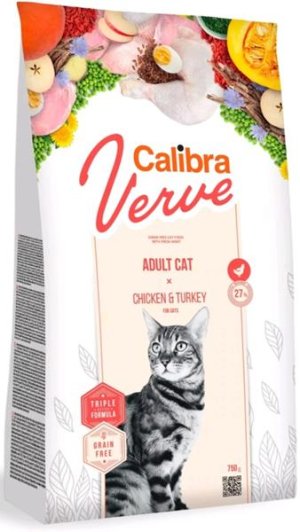 Calibra Cat Verve Adult Chicken & Turkey je k ompletné krmivo bez obilnín s vysokým obsahom čerstvého mäsa – s kuraťom a morkou. Receptúra je určená pre dospelé mačky.