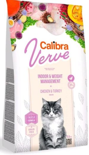 Calibra Cat Verve Indoor + Weight Management Chicken & Turkey je k ompletnému krmivu bez obilnín s vysokým obsahom čerstvého mäsa – s kuraťom a morkou. Receptúra je určená pre mačky žijúce v domácnosti a taktiež pre tie, ktoré potrebujú strážiť váhu.