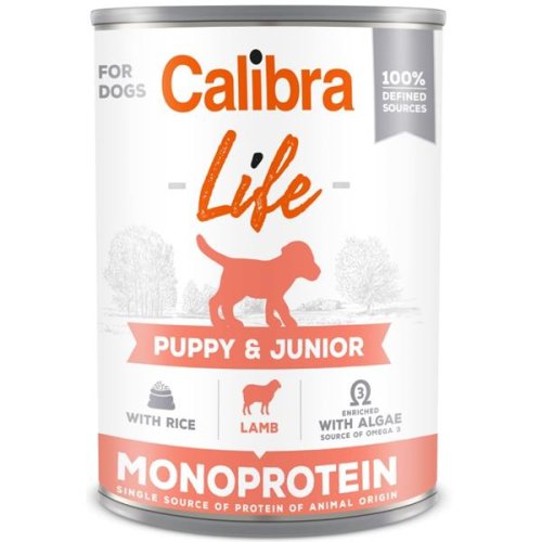 Calibra Dog Life Puppy & Junior Lamb with Rice - receptúra konzervy s jahňacím a ryžou je kompletným krmivom, ktoré je určené pre šteňatá a je vhodná aj pre gravidné alebo dojčiace sučky.
