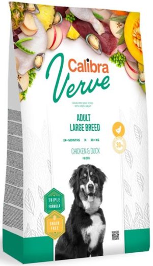Kompletné granulované krmivo s čerstvým kuracím mäsom bez obilnín pre dospelých psov veľkých plemien s hmotnosťou nad 30 kg. Receptúra je postavená ako kompletné suché krmivo s 30% čerstvého kuracieho mäsa a kvalitným kačacím proteínom, ktoré zaručujú psovi optimálnu dávku kvalitnej výživy. Krmivo zodpovedá najvyšším požiadavkám na prirodzené stravovanie psa v súlade s jeho fyziologickými potrebami. Čerstvé mäso je vysoko výživným zdrojom bielkovín, vyznačuje sa atraktívnou chuťou a je vhodné aj na citlivé zažívanie. Bezobilninová receptúra je skvele stráviteľná. Obsahuje kvalitné zdroje proteínu, ktoré sú zo 70% živočíšneho pôvodu, a tiež adekvátne množstvo sacharidov a vlákniny, je energeticky starostlivo vyvážená. Hlavné výhody Calibra Dog Adult Large Chicken & Duck: TRIPLE ACTIVE FORMULA - unikátna kombinácia vybraných funkčných aditív.