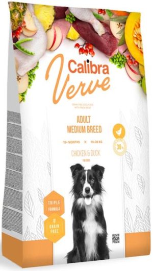 Kompletné granulované krmivo s čerstvým kuracím mäsom bez obilnín pre dospelých psov stredných plemien s hmotnosťou 10-30 kg. Krmivo obsahuje 30% čerstvého kuracieho mäsa, ktoré spolu s kvalitným kačacím proteínom zaistí psovi optimálnu dávku výživy. Krmivo zodpovedá najvyšším požiadavkám na prirodzené stravovanie psa v súlade s jeho fyziologickými potrebami. Čerstvé mäso je vysoko výživným zdrojom bielkovín. Vyznačuje sa atraktívnou chuťou a jeho výhodou je, že je dobre znášané aj psíky s citlivým zažívaním. Grain free receptúra je teda skvele stráviteľná. Okrem obsahu kvalitných zdrojov proteínu, ktoré sú zo 75 % živočíšneho pôvodu, obsahuje aj adekvátne množstvo sacharidov a vlákniny, je teda energeticky starostlivo vyvážená. Hlavné výhody Calibra Dog Adult Medium Chicken & Duck Calibra: TRIPLE ACTIVE FORMULA – unikátna kombinácia vybraných funkčných aditív.