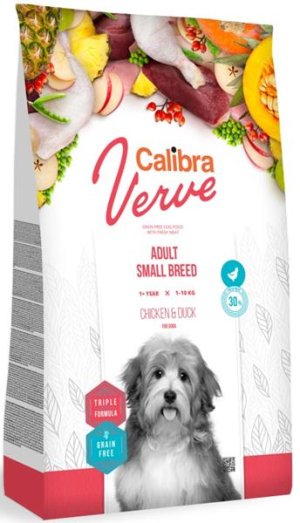 Kompletné granulované krmivo s čerstvým kuracím mäsom bez obilnín pre dospelých psov malých plemien s hmotnosťou 1-10 kg. Vysoký obsah čerstvého kuracieho mäsa 30% a kvalitný kačací proteín v tejto receptúre poskytne psovi výživu v súlade s jeho prirodzenými stravovacími inštinktmi a fyziologickými potrebami. Čerstvé mäso je vysoko výživným zdrojom bielkovín, ktorý sa vyznačuje pre psíka atraktívnou chuťou, a je tiež vhodné aj pre citlivé zažívanie. Receptúra bez obilnín je skvele stráviteľná. Obsahuje kvalitné zdroje proteínu, ktoré sú zo 75% živočíšneho pôvodu, a tiež adekvátne množstvo sacharidov a vlákniny, je teda energeticky starostlivo vyvážená. Hlavné výhody Calibra Dog Adult Small Chicken & Duck: TRIPLE ACTIVE FORMULA - unikátna kombinácia vybraných funkčných aditív.