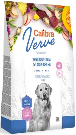 Kompletné granulované krmivo s čerstvým kuracím mäsom bez obilnín pre dospelých psov nad 6 rokov stredných a veľkých plemien s hmotnosťou 10-90 kg. S obsahom 30% čerstvého kuracieho mäsa v kombinácii s luxusným kačacím proteínom je to krmivo, ktoré zodpovedá najvyšším požiadavkám na prirodzené stravovanie psa, v súlade s jeho fyziologickými potrebami. Adekvátna výživa pre zrelého psa je doplnená o zvýšené množstvo chondroprotektívnych látok pre namáhané kĺby väčších psíkov. Čerstvé mäso je vysoko výživným zdrojom bielkovín, ktorý sa vyznačuje atraktívnou chuťou, a je vhodné aj na citlivé zažívanie. Grain free receptúra je skvele stráviteľná, obsahuje kvalitné zdroje proteínu, ktoré sú z 65% živočíšneho pôvodu, a tiež adekvátne množstvo sacharidov a vlákniny, je teda energeticky starostlivo vyvážená. Hlavné výhody Calibra Dog Verve GF Senior Medium & Large Chicken & Duck TRIPLE ACTIVE FORMULA - unikátna kombinácia vybraných funkčných aditív.