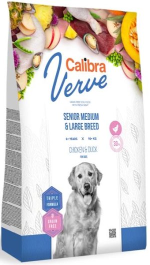 Kompletné granulované krmivo s čerstvým kuracím mäsom bez obilnín pre dospelých psov nad 6 rokov stredných a veľkých plemien s hmotnosťou 10-90 kg. S obsahom 30% čerstvého kuracieho mäsa v kombinácii s luxusným kačacím proteínom je to krmivo, ktoré zodpovedá najvyšším požiadavkám na prirodzené stravovanie psa, v súlade s jeho fyziologickými potrebami. Adekvátna výživa pre zrelého psa je doplnená o zvýšené množstvo chondroprotektívnych látok pre namáhané kĺby väčších psíkov. Čerstvé mäso je vysoko výživným zdrojom bielkovín, ktorý sa vyznačuje atraktívnou chuťou, a je vhodné aj na citlivé zažívanie. Grain free receptúra je skvele stráviteľná, obsahuje kvalitné zdroje proteínu, ktoré sú z 65% živočíšneho pôvodu, a tiež adekvátne množstvo sacharidov a vlákniny, je teda energeticky starostlivo vyvážená. Hlavné výhody Calibra Dog Verve GF Senior Medium & Large Chicken & Duck TRIPLE ACTIVE FORMULA - unikátna kombinácia vybraných funkčných aditív.