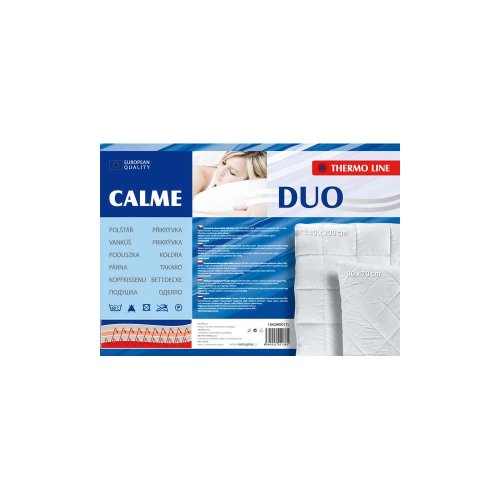 Vankúš a prikrývka THERMO LINE Duo, dvojvrstvová vysoko hrejivá prešitá prikrývka 140 x 200 cm, vankúš 70 x 90 cm, výplne - silikónované PE vlákno, deka 1600 gr.. Teplotný komfort zaručuje aj vzduchová vrstva, vzniknutá medzi dvoma prikrývkami. Prikrývka je nadýchaná a dobre priľnavá. Vyrobené v EÚ.