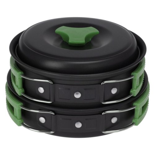 sada kastrólov, eloxovaný hliník s nerezovými úchytmi 201, sada 2ks: 1x kastról s pokrievkou (14x14x7cm), 1x kastról (15x15x4cm), so sklopnými úchytmi v zelenej farbe, balenie sady v čiernom puzdre