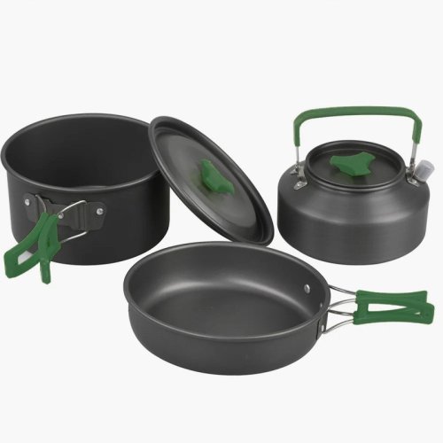 sada kastrólov, eloxovaný hliník s rukoväťami z nerezovej ocele 201, sada 3ks: panvica s pokrievkou (178x90mm), panvica (180x43mm), kanvica s pokrievkou (151x75mm, 1000ml), skladacia rukoväť v zelenej