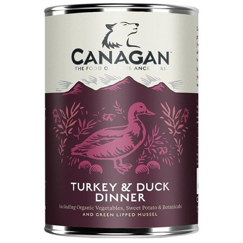 Šťavnatá mäsová konzerva Canagan Turkey & Duck Dinner. Večera s morkou a kačicou v receptúre bez obilnín - kompletné krmivo pre dospelých psov. CANAGAN konzervy pre psov predstavujú kompletné a vyvážené krmivá, vyrábané bez obilnín, s bio zeleninou aj ovocím a čerstvým mäsom či rybami. Všetky suroviny sú dovážané čerstvé každý deň as láskou spracovávané do jedinečných receptúr pre našich štvornohých priateľov. PRÍRODNÁ STAROSTLIVOSŤ O KĹBY - zelené mušle (Slávka zelenoústá) sú prirodzeným zdrojom glukosamínu. Lososový olej poskytuje množstvo esenciálnych omega 3 mastných kyselín. NAJLEPŠIE KÚSKY MÄSA - vďaka krehkým kúskom mäsa a rýb sú krmivá CANAGAN tak vynikajúce aj zdraviu prospešné. Zloženie: čerstvo pripravené morčacie mäso (40 %), čerstvo pripravené kačacie mäso (25 %), batáty (sladké zemiaky), bio mrkva, bio hrach, bio brokolica, minerálne látky, slávka zelenoústa*, lososový olej, bio jablká, bio špenát , morské riasy, petržlen, juka, šípky, žihľava, nechtík, brest, aníz, mäta, rozmarín.