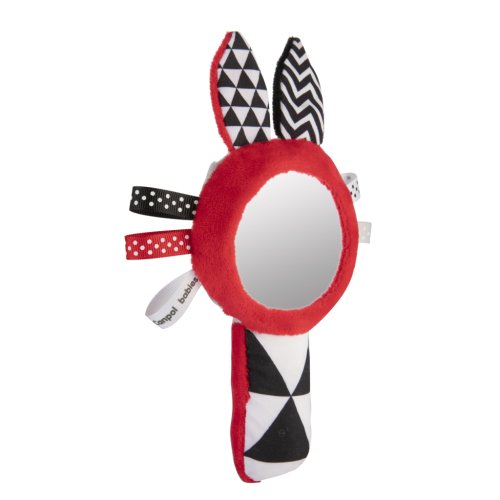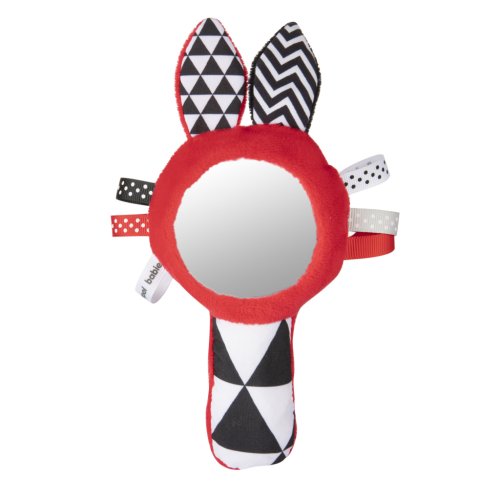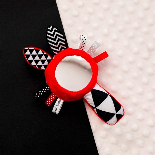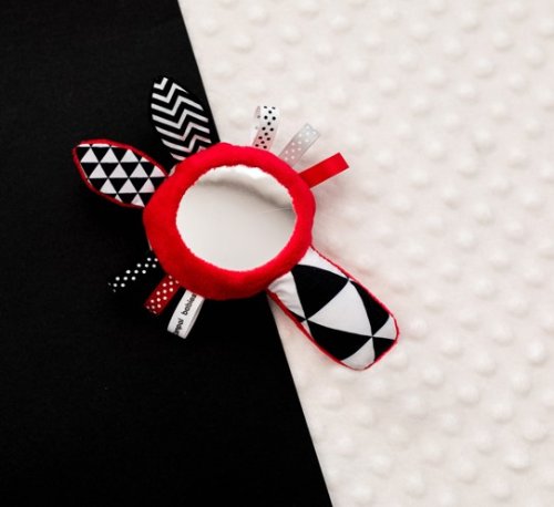 Kontrastná pískacia činka so zrkadielkom SENSORY. Vďaka praktickému tvaru je možné hračku jednoducho uchopiť. Činka disponuje pískacími elementmi, zrkadlom a látkovými stužkami. Senzorické farby stimulujú rozvoj zmyslov dieťaťa.