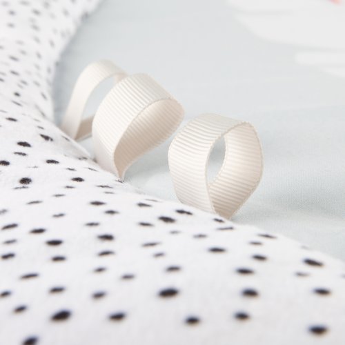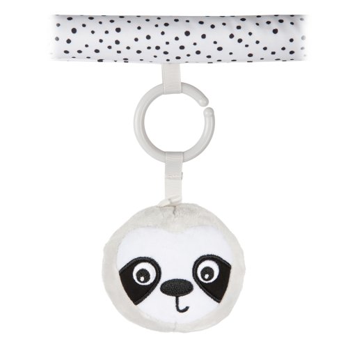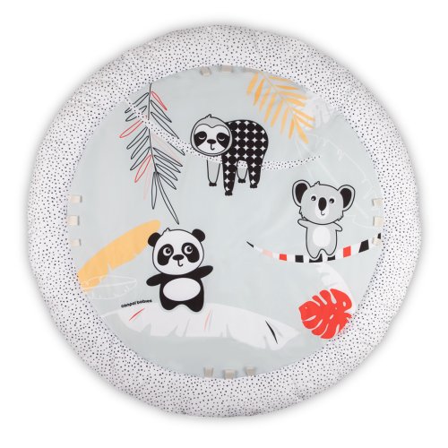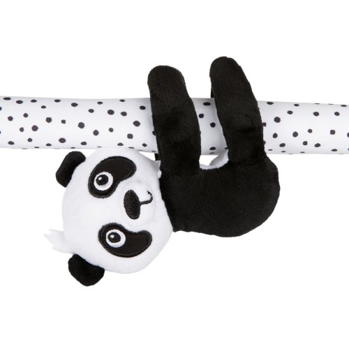 Hračky sú zavesené na oblúkoch, ktoré možno ľahko sňať a podložku umyť alebo vziať so sebou kamkoľvek, kde chcete vytvoriť detský priestor a zaistiť tak bezpečný a čistý kus podlahy. so zrkadlom obklopeným farebnými visačkami a hrkálkou a hryzátko, ktoré prinesie úľavu pri prerezávaní zúbkov, veľké odnímateľné zrkadlo, ktoré je možné pripevniť kamkoľvek a kedy bábätko vyrastie povzbudí k ležaniu na brušku a pandu s pískadlom a labkami na suchý zips, vďaka ktorým ich môžete spojiť a omotať okolo čelenky podložky alebo priečky detskej postieľky.
