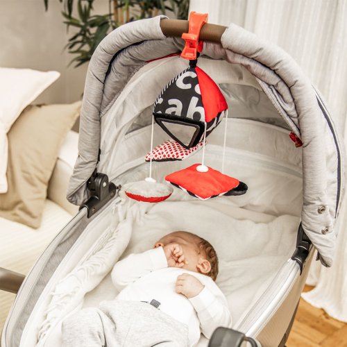 Kontrastná závesná hračka s klipom SENSORY. Hračku je možné pomocou klipu pripevniť na požadované miesto – kočík, postieľku alebo autosedačku. Praktický doplnok disponuje šuštiacimi a zvoniacimi elementmi, zrkadlom, hrkálkou a odnímateľnými plyšovými prvkami. Senzorické farby stimulujú rozvoj zmyslov dieťaťa.