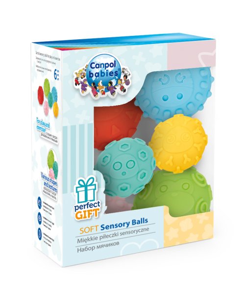 Jemné senzorické loptičky sú určené predovšetkým na zábavu a objavovanie v prvých mesiacoch života bábätiek. Tieto loptičky pomáhajú rodičom podporiť vývoj ich bábätiek vo veľmi rannej fáze. Rozmanité tvary a materiály poskytujú rôznorodé senzorické vnemy. Umožňujú trénovať úchop a stimulovať dotyk. Svieže, veselé farby povzbudia malé stvorenia k aktivite a hre. Loptičky môžu byť taktiež použité pre jemnú masáž. Set obsahuje 6 loptičiek rôznych farieb, ktoré sú zabalené v atraktívnej darčekovej krabici a neobsahujú BPA.