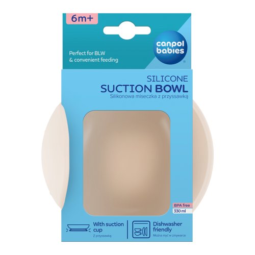 Detská miska Canpol babies má protišmykovú prísavku, ktorá zabraňuje nekontrolovanému pohybu misky po povrchu stola alebo dosky kŕmiacej stoličky a zabraňuje prevráteniu alebo úplnému zhodeniu riadu na podlahu. Zaoblené tvary a zvýšený, profilovaný okraj misky uľahčujú dieťaťu naberanie jedla. Je vyrobená zo 100% vysoko kvalitného potravinárskeho silikónu. Silikónový riad je flexibilný a trvanlivý, odolný proti nárazom a pádom, nepohlcuje pachy. Perfektný na podávanie polievky, cestovín, jogurtu s ovocím alebo mlieka s cereáliami. Miska Canpol babies sa ľahko čistí a je odolná voči vysokým teplotám - je možné ju ohrievať v mikrovlnnej rúre a umývať v umývačke.