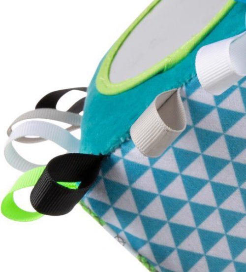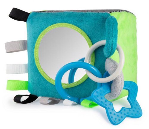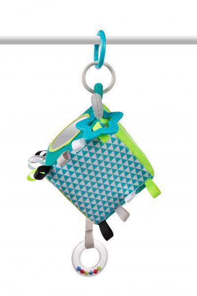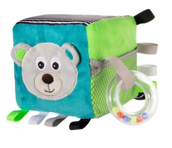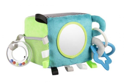 Hračka je vyrobená z rôznych textúr materiálov, ktoré stimulujú hmat dieťaťa. Zvoniace a šuštiace prvky skvele budia pozornosť. Kocka disponuje rôzne farebnými stuhami, ktoré povzbudzujú dieťa hračku uchopiť. Z jednej strany je hračka zdobená čierno-bielymi prúžkami, tie sú najužitočnejšími pomocníkmi na rozpoznávanie farieb u tých najmenších detí.