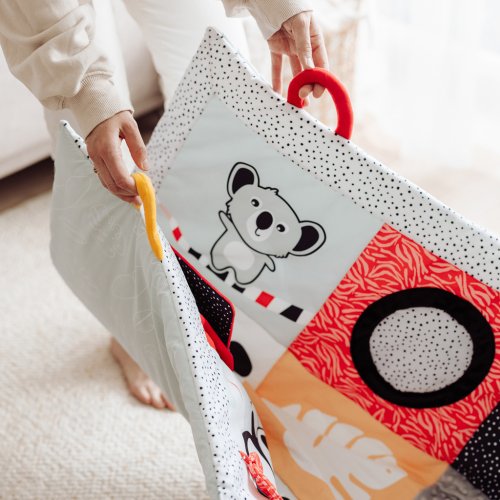 Vzdelávacia podložka Canpol babies sa ľahko skladá, má pohodlnú rukoväť, vďaka ktorej sa ľahko prenáša, takže môžete vytvoriť detský priestor, kdekoľvek budete potrebovať. Veľké zrkadlo povzbudzuje a predlžuje lezenie na brušku, počas ktorého môže bábätko zakaždým preskúmať rôzne časti podložky. Veľké množstvo zmyslových prvkov zapája detské zmysly: zrak, sluch a hmat. Rôzne textúry materiálov, kontrastné farby a vzory a jemné zvuky sú skvelou zábavou pre rozvíjajúce sa zmysly vášho bábätka od prvých okamihov života.