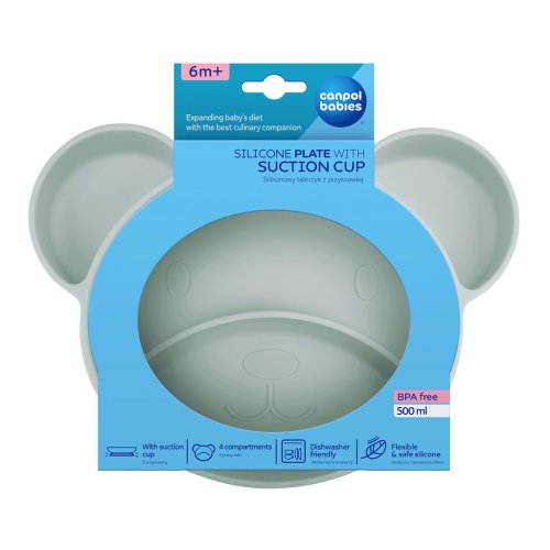 Tanier má protišmykovú prísavku, ktorá zabraňuje nekontrolovanému pohybu po povrchu stola alebo dosky kŕmiacej stoličky a zabraňuje prevráteniu alebo úplnému zhodeniu riadu na podlahu. Tanier je vyrobený zo 100% vysoko kvalitného potravinárskeho silikónu. Štyri priehradky uľahčujú porciovanie a triedenie rôznych pokrmov, čo povzbudzuje bábätko, aby skúšalo nové chute a jedlo samo. Silikónový riad je flexibilný, odolný a nerozbitný, čo je pre malé deti veľmi dôležité. Možno umývať v umývačke a ohrievať v mikrovlnnej rúre.