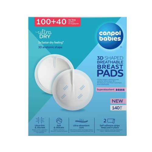 Priedušné jednorazové vložky do podprsenky Canpol babies sú určené ženám v neskoršej fáze tehotenstva a dojčiacim mamičkám. Nedráždi citlivú pokožku prsníka ani bradavky. Mäkká absorpčná vrstva zadržuje vytekajúce mlieko a nepriepustná vonkajšia vrstva zabraňuje zašpineniu bielizne. Samolepiace páska pomáha fixovať vložku na správnom mieste. Vložky sa výborne prispôsobia tvaru prsníka a ich použitie je veľmi diskrétne. Dodávajú sa vo výhodnom balení 100 + 40 kusov.