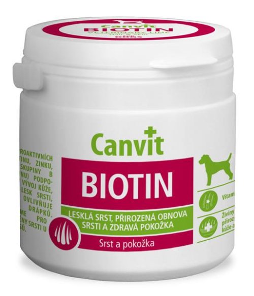 Canvit Biotin regeneruje poškodenú srsť, urýchľuje pĺznutie a pomáha pri riešení kožných ťažkostí u psov malých a stredných plemien. Podáva sa každý deň priamo z ruky alebo rozdrvený do krmiva. Tablety sú ochutené 100% pečeňou a psy ich tak prijímajú veľmi radi a ochotne ako maškrtu.