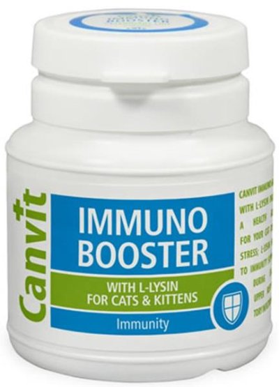 Canvit Immuno Booster pre mačky s L-Lyzínom a Kurkuminom pre pohotovostné naštartovanie imunity v krízových situáciách a pre účinné riešenie mačacej nádchy. Podáva sa spoločne s krmivom alebo priamo do tlamičky v dávke 1 tabletka na každých 2,5 kg váhy mačky za deň. Tabletky sú ochutené 100% prírodnou pečeňou, vďaka tomu majú pre mačky veľmi atraktívnu chuť i vôňu a mačky ich ochotne prijímajú ako pochúťku priamo z ruky.