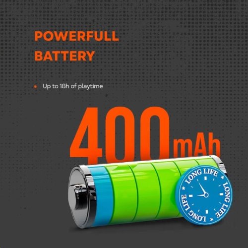 Batéria s kapacitou 400 mAh poskytuje úctyhodných 18 hodín prehrávania a plne sa nabije iba za 2-3 hodiny prostredníctvom USB-C.