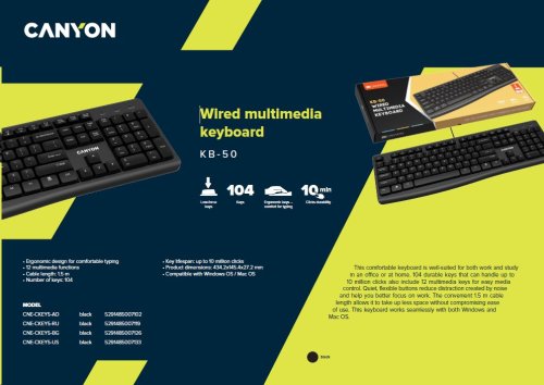 Práca na tejto klávesnici je veľmi pohodlná, takže sa hodí na štúdium, do kancelárie aj k domácemu počítaču. Medzi 104 odolnými klávesmi, ktoré zvládnu až 10 miliónov kliknutí, je aj 12 multimediálnych kláves pre jednoduché ovládanie médií. Tiché a flexibilné tlačidlá zabraňujú rozptyľovaniu pozornosti spôsobenej hlukom a pomáhajú vám lepšie sa sústrediť na prácu. Vďaka dostatočnej dĺžke kábla 1,5 m zaberá menej miesta, ale nie na úkor ľahkého používania. Funguje bez problémov so systémami Windows aj MacOS.