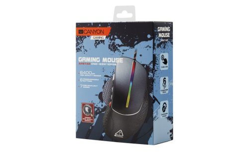 Drôtová herná myš so 6 nastaviteľnými tlačidlami, pixart optický senzor, 6 úrovní DPI až do úrovne 6400, životnosť až 2 milióny kliknutí, USB PVC opletený kábel v dĺžke 1,65m, pogumovaný povrch a farebná RGB podsvietenie, rozmer 123x81x53mm, váha 150g
