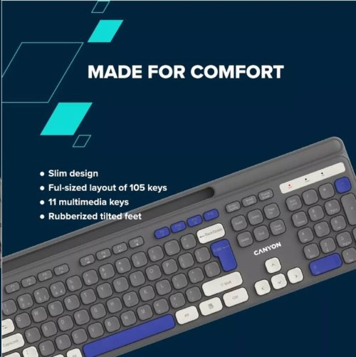 Vstúpte do sveta bezdrôtových kúziel s kombináciou klávesnice a myši Canyon! Čaká na vás pracovný priestor bez neporiadku. Klávesnica sa stane vaším partnerom pre produktivitu, pretože má plnohodnotné rozloženie so 105 klávesmi vrátane multimediálnych skratiek, ktoré urýchlia váš pracovný proces. Spínače s nožnicovým mechanizmom zaisťujú tiché písanie, takže sa môžete sústrediť na svoje úlohy bez nepríjemného klapania. Tieto spínače sú tiež odolné, majú životnosť 10 miliónov stlačení. Vďaka ergonomickému rozloženiu je písanie na tejto klávesnici ako hračka. Súčasťou setu je myš, ktorá má tiché spínače a pekný design. Jej na dotyk mäkký pogumovaný povrch je odolný a šetrný k vašej dlani. Je vybavená šiestimi tlačidlami s nastaviteľným DPI. Tento set Canyon je napájaný štandardnými alkalickými batériami a je vždy pripravený na akciu. Vyskúšajte tri jedinečné farebné kombinácie, kedy myš vždy ladí s klávesnicou. Užívajte si slobody s bezdrôtovou kombináciou Canyon HSET-W5!