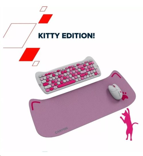 Myš Kitty Edition má štyri tiché tlačidlá a nastaviteľné DPI 800/1200/1600. Vďaka presnému optickému snímaču a životnosti 3 milióny kliknutí zvládne táto myš akúkoľvek každodennú činnosť. Pre úplné pohodlie a estetický pôžitok je súčasťou sady aj podložka pod myš.