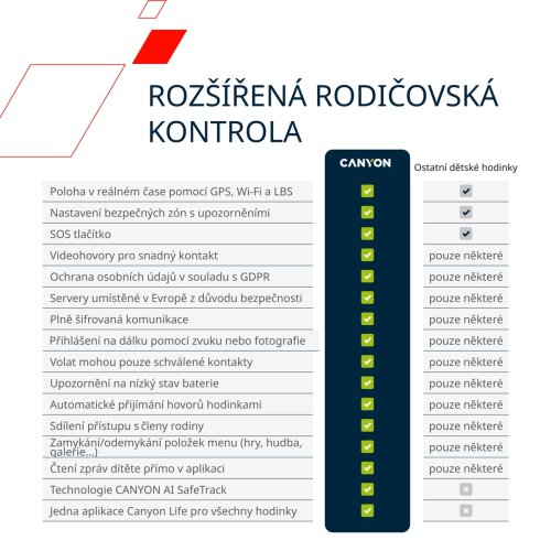 Bezpečnostné funkcie SOS, až 50 kontaktov, prichádzajúce hovory, hlasový chat