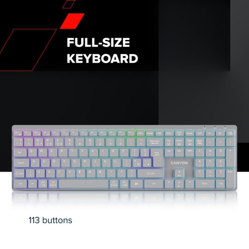 Klávesnica má 113 kláves s nožnicovým mechanizmom , ktorý zaisťuje tiché, plynulé a pohodlné písanie. RGB podsvietenie v 7 farbách a osvetlení klávesov vám umožní pracovať aj v tme a zároveň dodá pracovnému priestoru štýl. Odolnosť proti poliatiu chráni klávesnicu pred drobnými nehodami a vstavaná 1600mAh batéria zaistí dlhú výdrž bez nutnosti výmeny batérií.