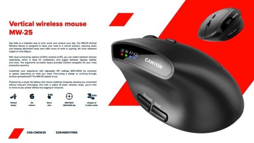 Objavte pohodlnejší spôsob práce aj zábavy s vertikálnou bezdrôtovou myšou Canyon MW-25. Jej ergonomický dizajn podporuje prirodzenú polohu ruky, čím výrazne znižuje namáhanie zápästia a predlaktia. Ideálna voľba pre každého, kto trávi pri počítači dlhé hodiny – či už v kancelárii, doma alebo na cestách.