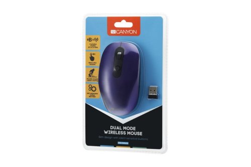 Táto minimalistická myš je veľmi pohodlná pri každodennom používaní vďaka svojej kompaktnej veľkosti, príjemnému pogumovanému povrchu a 6 tichým odolným tlačidlám. Vďaka technológii úspory energie zabudnite na vybitú batériu. Táto myš dokáže fungovať v dvoch režimoch - Bluetooth a 2,4 GHz, takže keď zabudnete USB prijímač alebo potrebujete uvoľniť USB port, môžete použiť pripojenie pomocou rozhrania Bluetooth. Nielenže skvele padne do ruky, ale vďaka svojej originálnej metalickej farbe aplikovanej trojitým nanášaním aj veľmi dobre vyzerá. Zamerajte sa na to najdôležitejšie a dovoľte myši Canyon, aby sa stala vašim spoľahlivým asistentom v akejkoľvek pracovnej situácii.