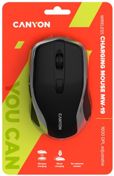 Pri používaní tejto bezdrôtovej myši sa nemusíte obávať náhleho vybitia, môžete dobíjať ako drôtovo, tak bezdrôtovo. Stačí myš pripojiť na nabíjačku k vášmu smartfónu alebo položiť na špeciálnu podložku Canyon. Je to mimoriadne pohodlné! Moderný optický snímač, 6 tlačidiel, možnosť nastavenia 3 režimov DPI a jemný pogumovaný povrch – všetky tieto parametre vytvárajú z myši skvelý pracovný nástroj, ktorý dlho vydrží a poskytne špičkový komfort a úžasné ovládanie.