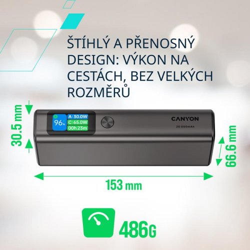 Powerbanka Canyon OnPower 230 ponúka kapacitu 20 000 mAh a výkon až 130 W na rýchle nabíjanie notebookov, telefónov i tabletov.