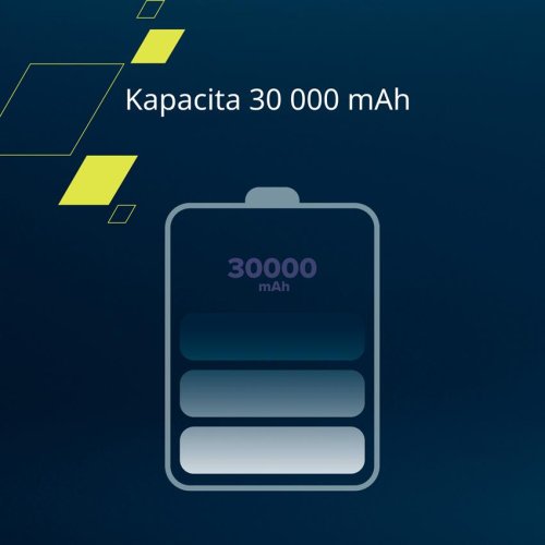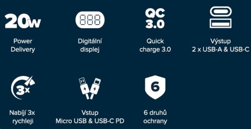 Kapacita 30 000 mAh vhodná pre opakované dobíjanie zariadenia Dodávajte energiu viacerým prístrojom súčasne cez dvojicu USB a USB-C výstup Bleskové dobíjanie zaistí technológia Qualcomm Quick Charge 3.0 a Power Delivery Kompaktné rozmery uľahčia prenášanie v taške či batohu Minimalistický displej informuje o aktuálnom stave batérie
