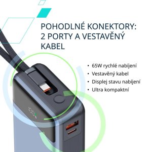 Život je príliš krátky na to, aby vás brzdila vybitá batéria! Predstavujeme vám powerbanku OnPower 600 - váš vreckový zdroj energie. OnPower 600 má obrovskú kapacitu 20 000 mAh a dodá vám na cestách energiu pre všetky vaše zariadenia kedykoľvek to budete potrebovať. Nezáleží na tom, či ste digitálni nomádi, cestovatelia alebo jednoducho len tí, ktorí si nemôžu dovoliť zostať bez energie, OnPower 600 udrží vaše zariadenie nabité po celé dni. Vstavaný 65W kábel powerbanky poskytuje bleskovú rýchlosť, čo výrazne skracuje dobu nabíjania. Pre vás to znamená menej času stráveného čakaním a viac času na to, čo máte radi. Vďaka elegantnému a kompaktnému dizajnu sa ľahko zmestí do každého vrecka alebo tašky a stane sa dokonalým spoločníkom na cestách. Prehľadný displej sa postará o to, aby ste boli stále informovaní o stave nabíjania. Predstavte si, že budete mať energiu na dlhý let, kempovanie alebo náročný pracovný deň bez jedinej myšlienky na vybitú batériu. S powerbankou OnPower 600 získate nezávislosť. Už žiadne zmeškané hovory, prerušené videokonferencie alebo vybité zariadenia. S OnPower 600 máte všetko pod kontrolou.