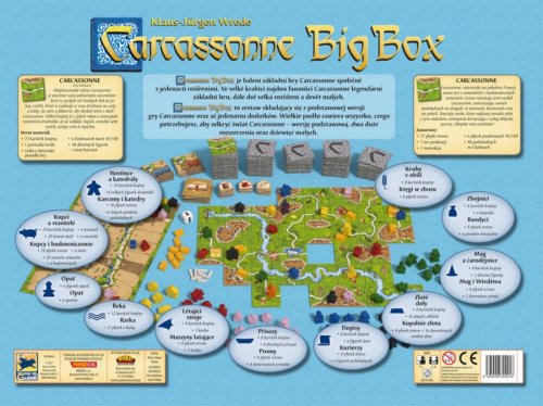 Základná hra Carcassonne: Juhofrancúzske mesto Carcassone je povestné svojim jedinečným opevnením, ktoré sa vyvíjalo od rímskych čias až po časy rytierov. Hráči sa vydávajú so svojou družinou na cesty a lúky, do miest a kláštorov, aby hľadali šťastie v okolí Carcassonne. Vzhľad krajiny je v ich rukách a strategické rozmiestnenie družiníkov, či už sedliakov, lupičov, mníchov alebo rytierov, určuje cestu k úspechu. Herný materiál: 72 kartičiek krajiny, 1 počítadlo bodov, české a slovenské pravidlá hry, 6 bodovacích kariet 50,100, 48 drevených figúrok v 6 farbách.