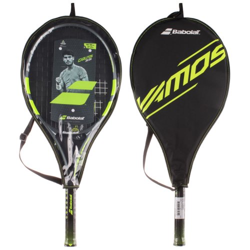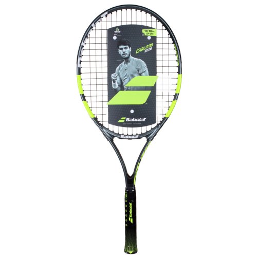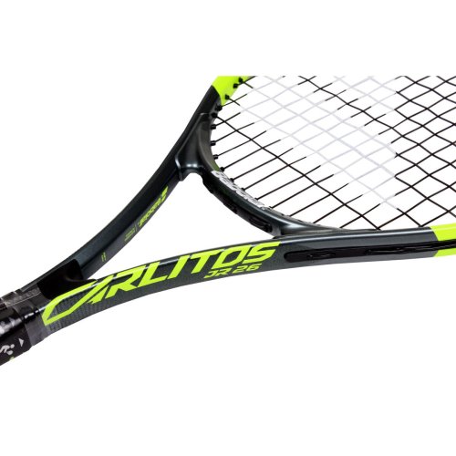 Detská raketa Babolat Carlitos JR 26 inšpirovaná šampiónom Carlosom Alcarazom je vhodná pre začínajúcich hráčov s výškou postavy 145 – 155 cm. Ľahká alumíniová konštrukcia umožňuje ľahkú hrateľnosť rakety. Raketa využíva dva prvky na výučbu: Learning tool 01 - memo grip - učí dieťa držať raketu na konci rukoväte; Learning tool 02 - right attitude - učí držať raketu v správnej polohe. Súčasťou rakety je aj obal s popruhom na pohodlné nosenie. - dĺžka: 26 in / 660 mm - hmotnosť: 240 g - veľkosť hlavy: 100 in2 / 645 cm2 - vzor výpletu: 16 x 17