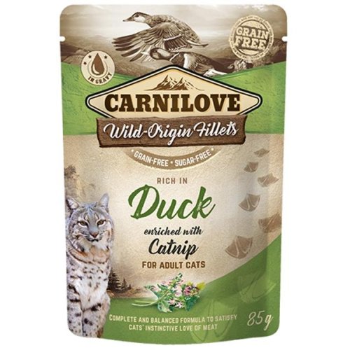Kapsička pre mačky Carnilove neobsahuje žiadne obilniny a cukor. Receptúra Duck je bohatá na kačacie mäso a je doplnená o šantu mačacie. Kačacie filety sú naložené v šťave. Ide o kompletné krmivo pre mačky. Kapsičky pre mačky Carnilove Cat Pouch je možné zakúpiť v 7 lahodných príchutiach.