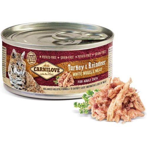 Konzerva pre mačky s bielym morčaním mäsom zo svaloviny a chutným sobím mäsom.