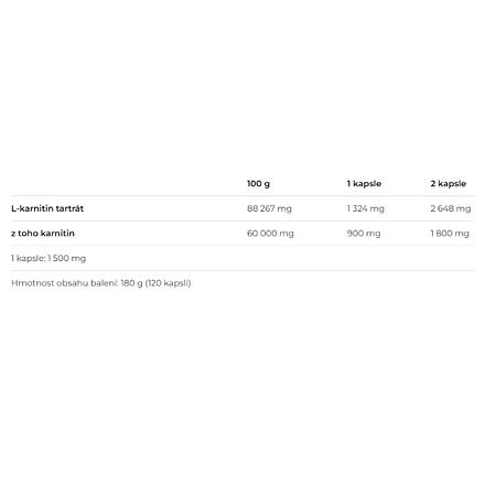 Čistá kryštalická forma karnitín tartrátu v podobe dobre vstrebateľných kapsúl, ktoré uľahčujú presné dávkovanie. Karnitín spolupôsobí ako prenášač molekúl mastných kyselín do mitochondrií buniek, kde dochádza k ich oxidácii za vzniku energie. Vhodný pre podporu výkonu aj diétneho režimu. značkový kryštalický karnitín Carnipure® 1 324 mg karnitín tartrátu v jednej kapsule ľahko vstrebateľnej kapsule Odporúčané dávkovanie: Užite 1 kapsulu ráno na lačno a 1 kapsulu 60 minút pred fyzickým výkonom. Zapite dostatočným množstvom vody. Maximálna denná dávka sú 2 kapsule. Neprekračujte odporúčané dávkovanie. Upozornenie: Doplnok stravy. Nenahrádza pestrú stravu. Nie je určené pre deti, tehotné a dojčiace ženy. Ukladajte mimo dosahu detí! Chráňte pred teplom, mrazom a vlhkosťou. Zloženie: L-karnitín tartrát, želatínová kapsula (želatína, farbivo oxid železa), plnidlo stearan horečnatý. Dodávateľ: NUTREND DS ., as ., Chválkovice 604, 779 00 Olomouc, Česká republika