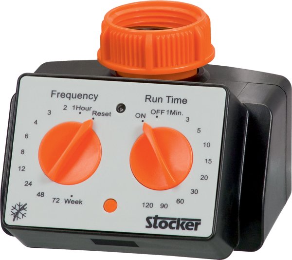 Časové spínače sú určené pre jednoduché vybudovanie jednoduchého automatického zavlažovania. Programovateľný - možnosti frekvencia: 1, 3, 5, 10, 15, 20, 30, 60, 90, 120 minút. Pripájajú sa na záhradnej kohút a nepotrebujú pripojenie do elektrickej siete, pretože sú napájané alkalickou batériou 9V (nie sú súčasťou dodávky). Za časový spínač sa napojí bežná záhradná hadica, ktorá je ďalej pripojená k jednotlivým nadzemným rozstrekovačom alebo kvapkovej závlahe. Časové spínače sú vyrobené z kvalitného plastu, ktorý odoláva poveternostným vplyvom, a sú určené ik vonkajšiemu použitiu. Pre správnu funkciu časového spínača musí byť dodržaný tlak vody min. 0,5 bar a max. 12 barov.