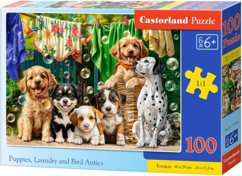 CASTORLAND Puzzle Šteňatá, bielizeň a vtáčie šantenie 100 dielikov