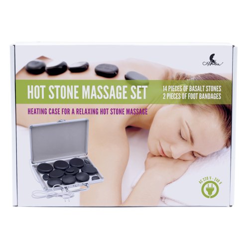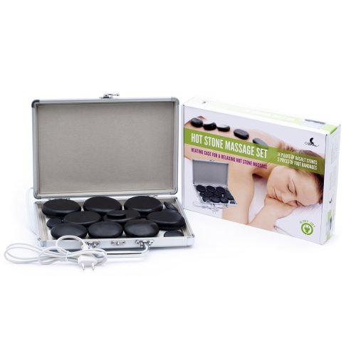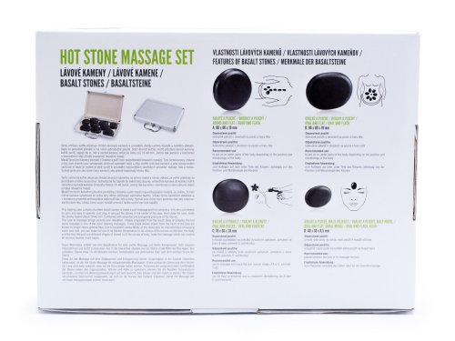 Súprava obsahuje 14 kusov masážnych lávových kameňov rôzneho tvaru a veľkostí pre dokonalú masáž celého tela. Kamene sú uložené v hliníkovom kufríku, ktorý jednoducho pripojíte do el. siete a necháte kamene nahriať na teplotu, ktorá je vám príjemná (max. 70°C). Súčasťou balenia sú 2ks bandáží na chodidlá pre praktické zafixovanie masážnych kameňov.