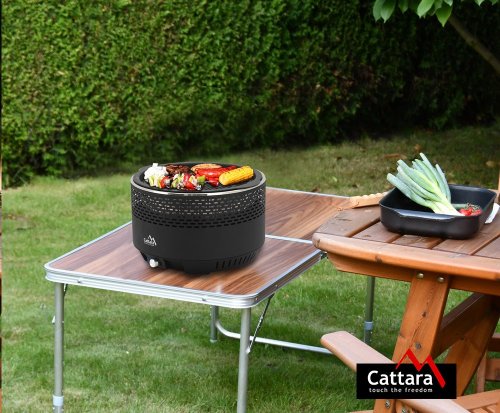 Gril je zhotovený z kvalitných materiálov, predovšetkým z ocele s tmavým práškovým lakovaním. Na grilovanie pokrmov je opatrený liatinovým roštom s priemerom 30 cm.