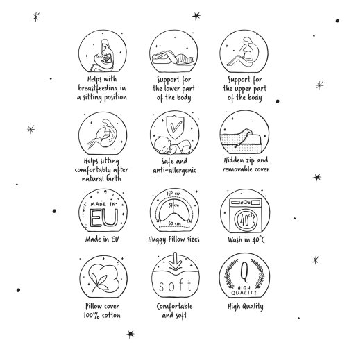 Vankúš Huggy je ekonomický multifunkčný vankúš, ktorý splní požiadavky zákazníkov, ktorí hľadajú praktické, pohodlné a kompaktné riešenia. Vankúš Huggy je výrobok, ktorý dokonale zapadá do dynamického životného štýlu moderných žien. Vďaka svojej ergonómii, veľkosti a kvalite spracovania je ideálny aj pre cestovanie. Vankúš s jednoduchou údržbou sa dodáva v snímateľnom poťahu z bavlneného úpletu príjemného na dotyk as výplňou z polyesterových guličiek. Výrobok má certifikát OEKO-TEX® STANDARD 100.